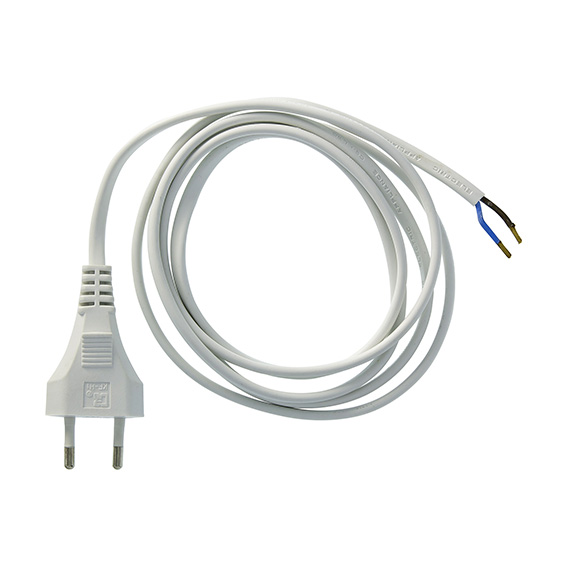 Een wit Eurosnoer met aangegoten kleine stekker van 2 meter lengte voor gebruik met onze transformatoren.